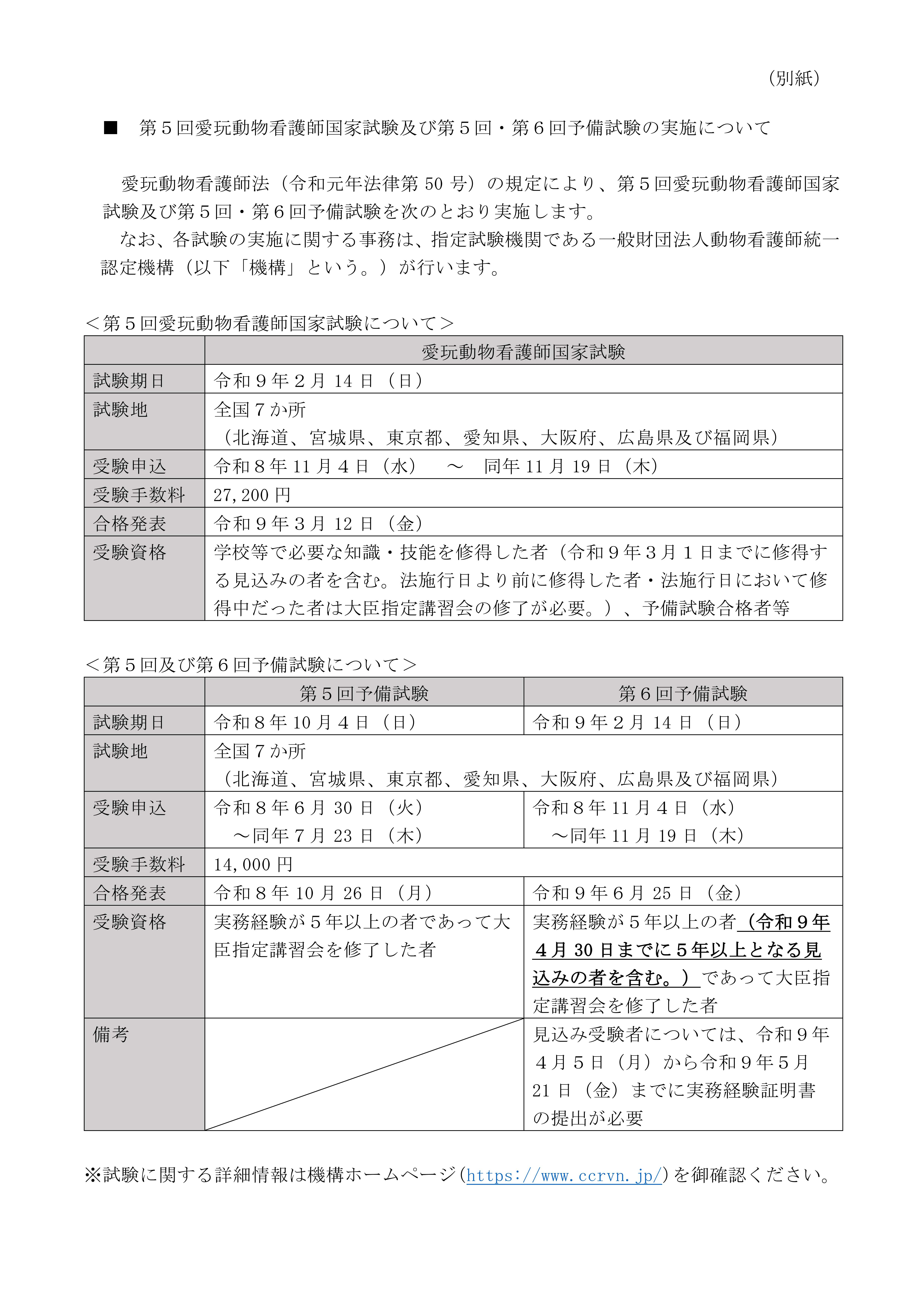 愛玩動物看護師法(令和元年法律第50 号)の規定により、第5回愛玩動物看護師国家試験及び第5回・第6回予備試験について、別紙のとおり実施するのでお知らせします。